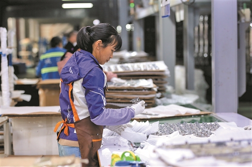 在柳州市德福德表面處理技術(shù)有限公司,工人復(fù)檢電鍍好的汽車配件。